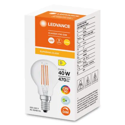 La lampada Ledvance Classic LED E14 Pera Filamento Chiara 3.4W 470lm - 927 Bianco Molto Caldo | Miglior resa cromatica - Dimmerabile - Sostitua 40W è il sostituto perfetto per le tue vecchie lampade 40W con attacco a vite piccolo E14 grazie alla sua tecnologia LED. Passare a LED ti offrirà molti vantaggi!