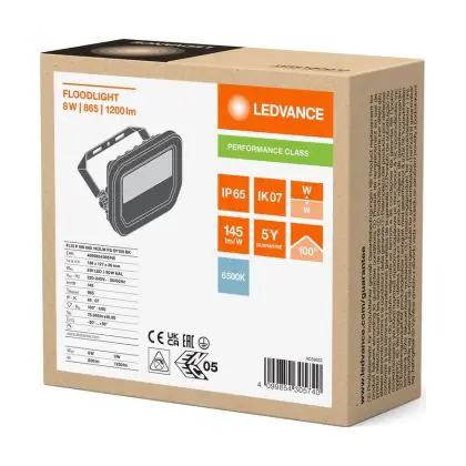Descrizione Ledvance Proiettore LED Aluminium Nero 8W 1200lm 100D - 865 Luce Del Giorno | IP66 - Simmetrico