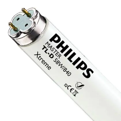I Philips TL-D Xtreme 58W 840 - 150cm (MASTER) sono tubi fluorescenti caratterizzati da una potenza di 58W e provvisti di attacco G13 che rientrano nella classe energetica 'A'. Questi tubi misurano 150cm. La vita dei medesimi é in media di 79.000 ore e questo é un elemento tipico della linea Philips TL-D Xtreme. Un accenno all'indice di resa cromatica che si pone nell'intervallo di 80-89Ra. La luce emessa da tali tubi é una luce bianca fredda, il che corrisponde ad una temperatura di colore di 4000K.